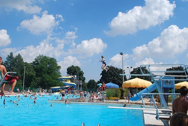 Brookfield’s community pool is 50 meters, with a water slide, two diving boards, a sand play area, geysers, a playground, and more. There is a concession stand and plenty of shade.