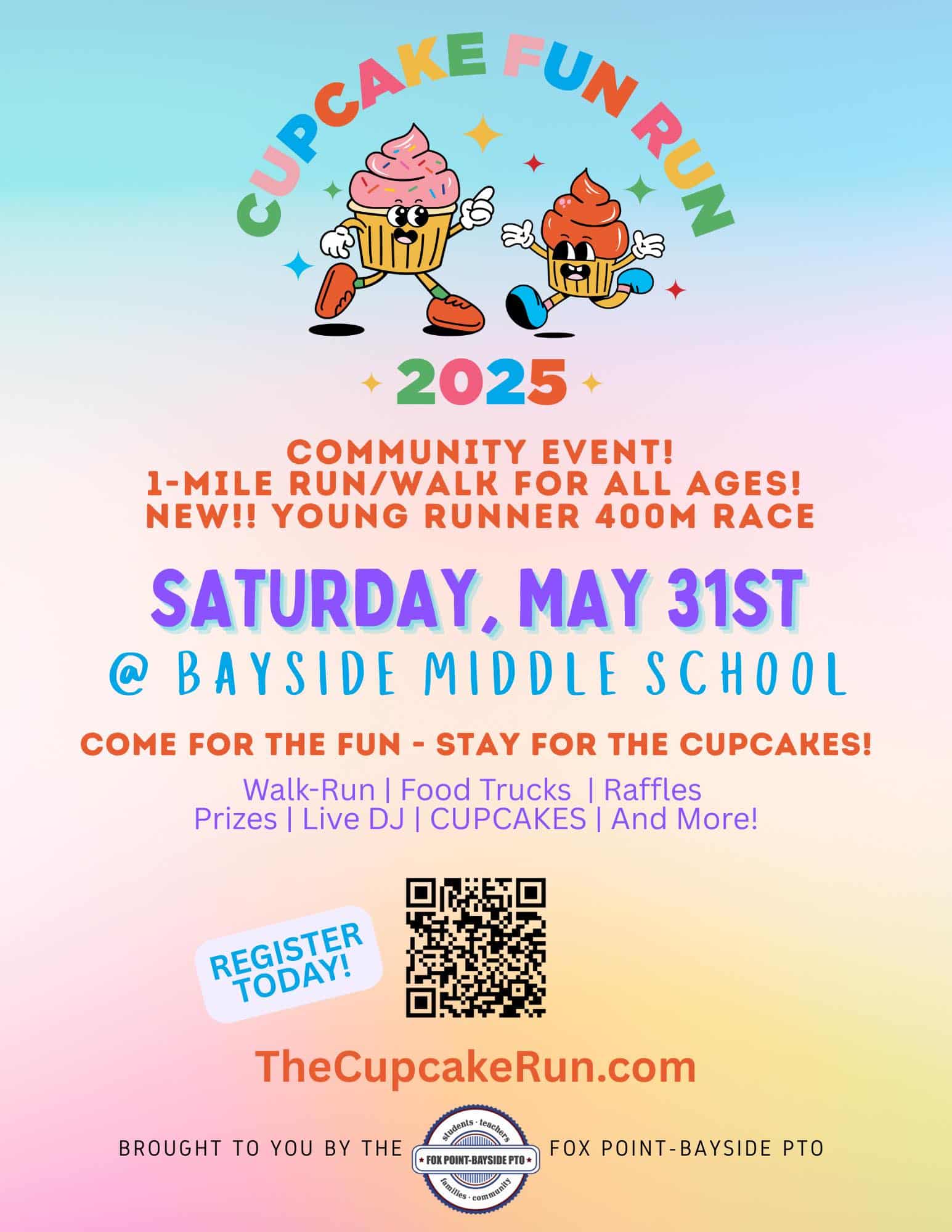 The race format is a flat 1-mile run & walk. We will have additional family-fun activities by the Bayside Middle School track and at Ellsworth Park immediately following the run! Join us for the run, enjoy a cupcake, and stay for the FUN.