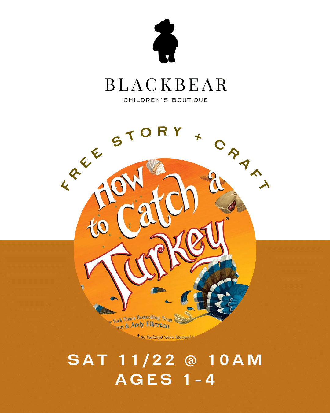 Join us at BlackBear Children’s Boutique on Saturday, November 22nd at 10AM for Magical Mornings, our FREE  storytelling and craft series! We’ll be reading “How to Catch a Turkey” and doing a matching craft & coloring activity to follow. Best-suited for ages 1-4 years. Hope to see you there!