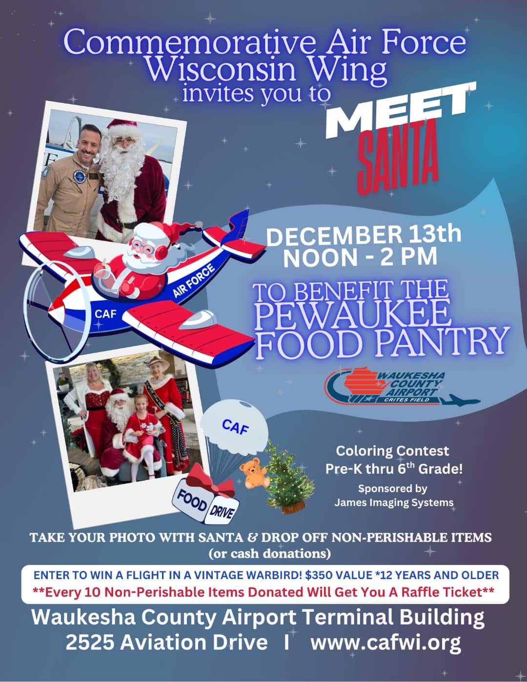 Santa arrives by Beechcraft T-34 at Noon at the Waukesha Airport terminal 2525 Aviation Drive. Take photos, meet Santa, coloring contest, drawing for a vintage warbird flight, and more. Runs to 2:00 PM. Bring a non-perishable food item for the Pewaukee Food Pantry.