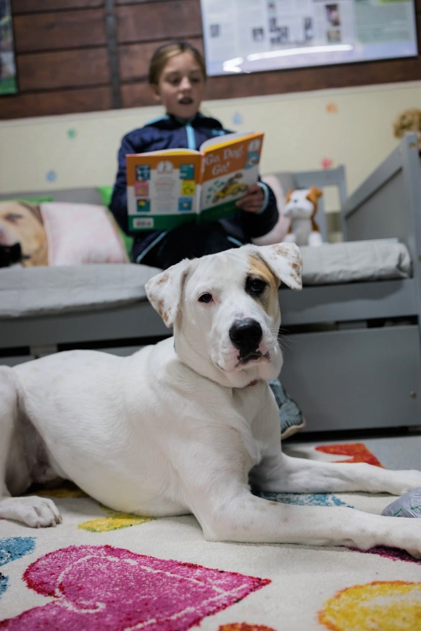 Children practice reading aloud and improve their fluency by sharing a story with a cuddly certified therapy dog.