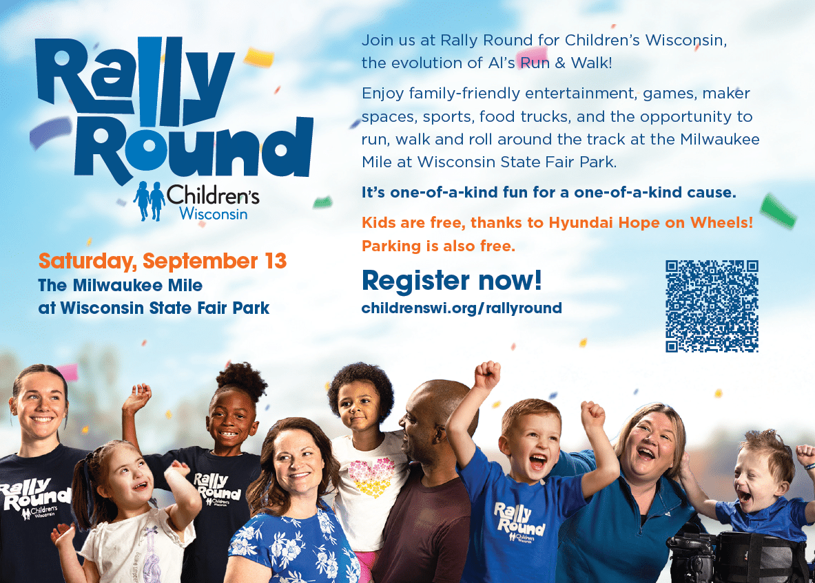 On Saturday, September 13, at the Milwaukee Mile at State Fair Park in Milwaukee, Wis., you’re invited to join us for Rally Round for Children’s Wisconsin, a one-of-a-kind event for a one-of-a-kind cause. It will be the biggest pep rally you’ll ever attend, and all proceeds benefit Children’s Wisconsin.