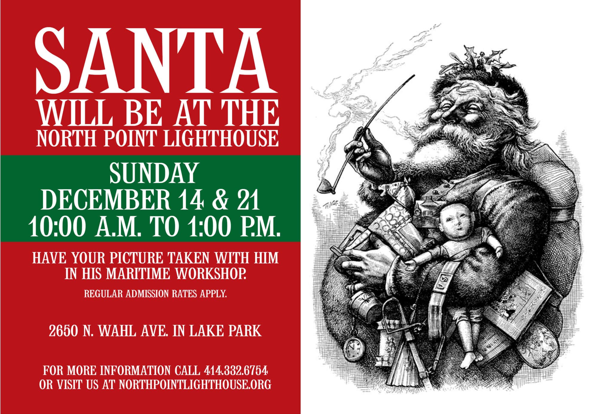 North Point Lighthouse Museum 2650 N Wahl Ave, Milwaukee, WI, United StatesHave your photo taken with Santa in the gallery at the North Point Lighthouse Museum! Climb the tower, browse the gift shop and take home a coloring sheet. Regular admission […]