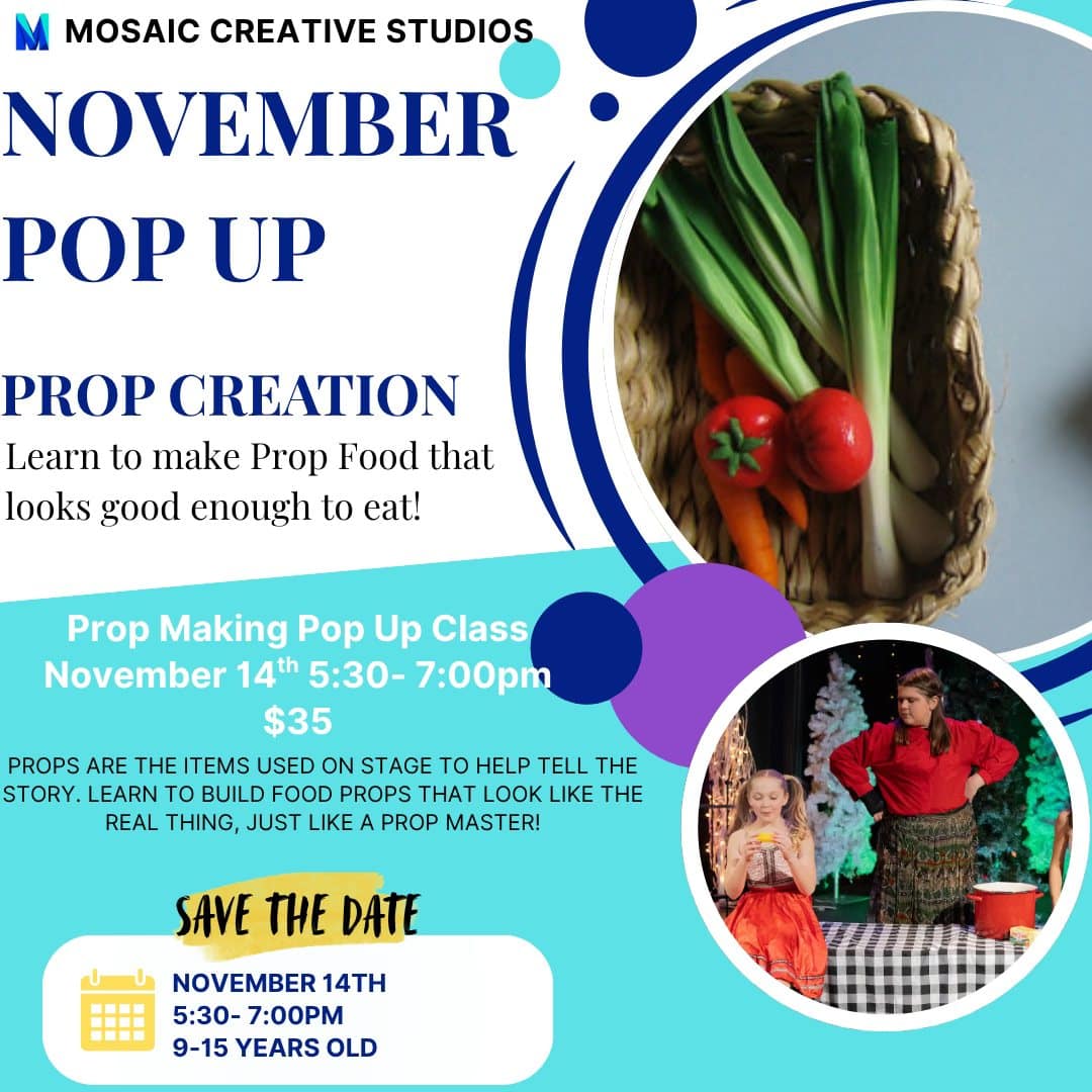 Learn to make Prop Food that looks good enough to eat! Props are the items used on stage to help tell the story. Learn to build food props that look like the real thing, just like a prop master! Ages 9-15 $35 To join email Sam@mosaiccreativestudios.com   Please note: Dates and times are subject to […]