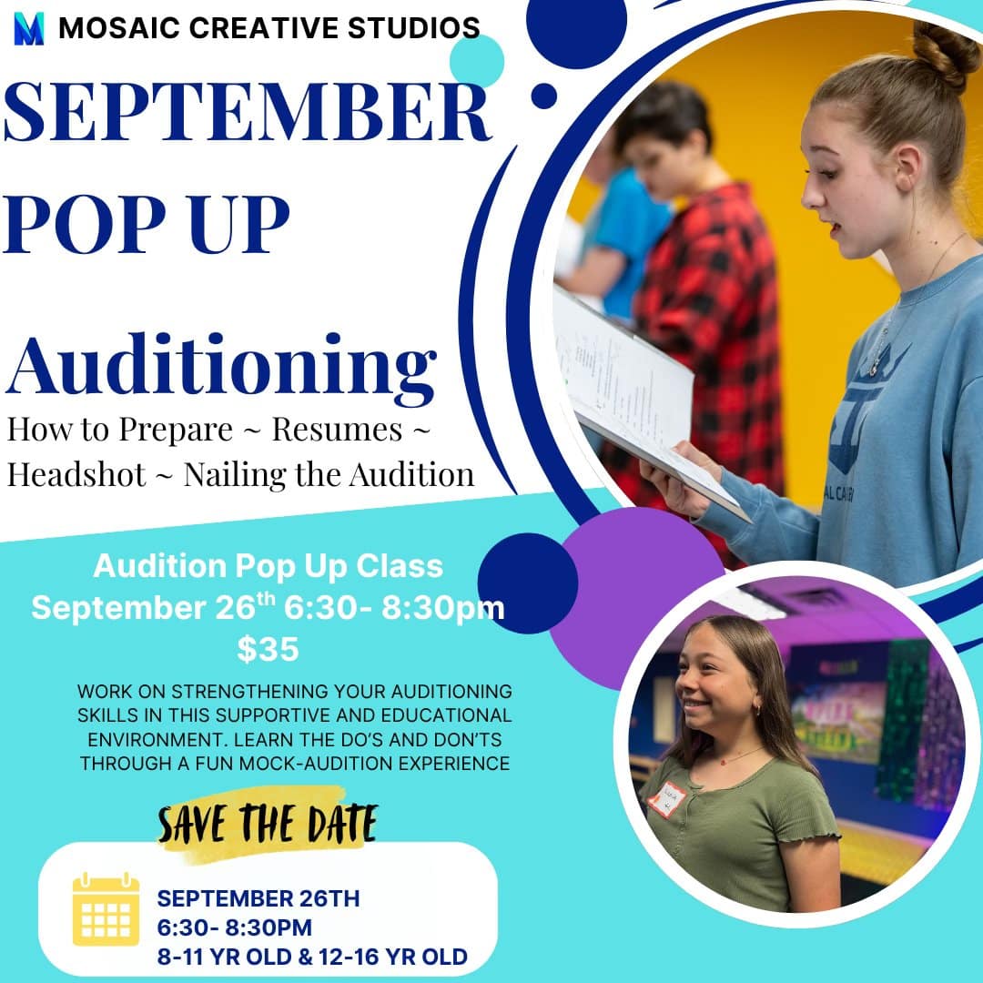 How to Prepare ~ Resumes ~ Headshot ~ Nailing the Audition! Work on strengthening your auditioning skills in this supportive and educational ENVIRONMENT. Learn the do’s and Don’ts through a fun mock-audition experience. Class is open to students 8-11 as well as kids 12-16. September 26th, 6:30- 8:30 pm $35 To Join Email Sam@mosaiccreativestudios.com   […]