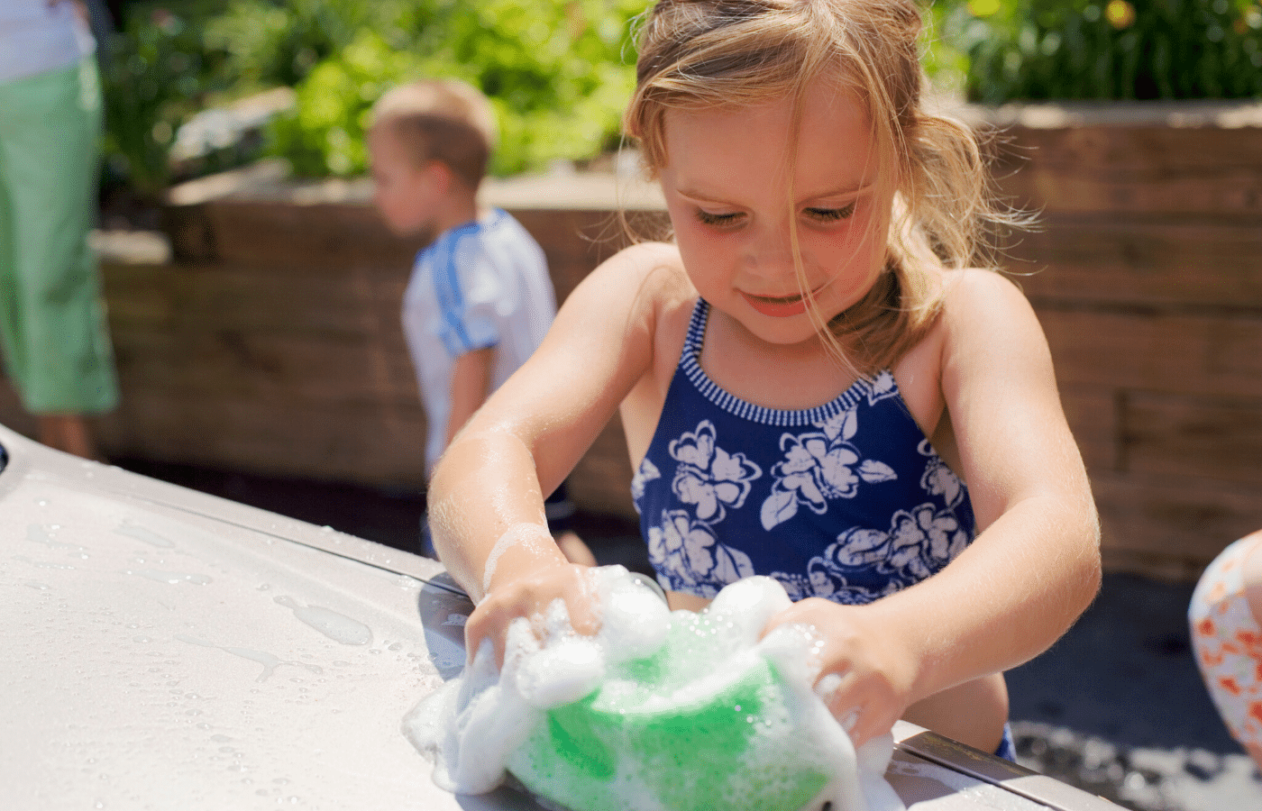 Put on music and let kids vacuum, wipe surfaces, scrub wheels, and rinse suds.