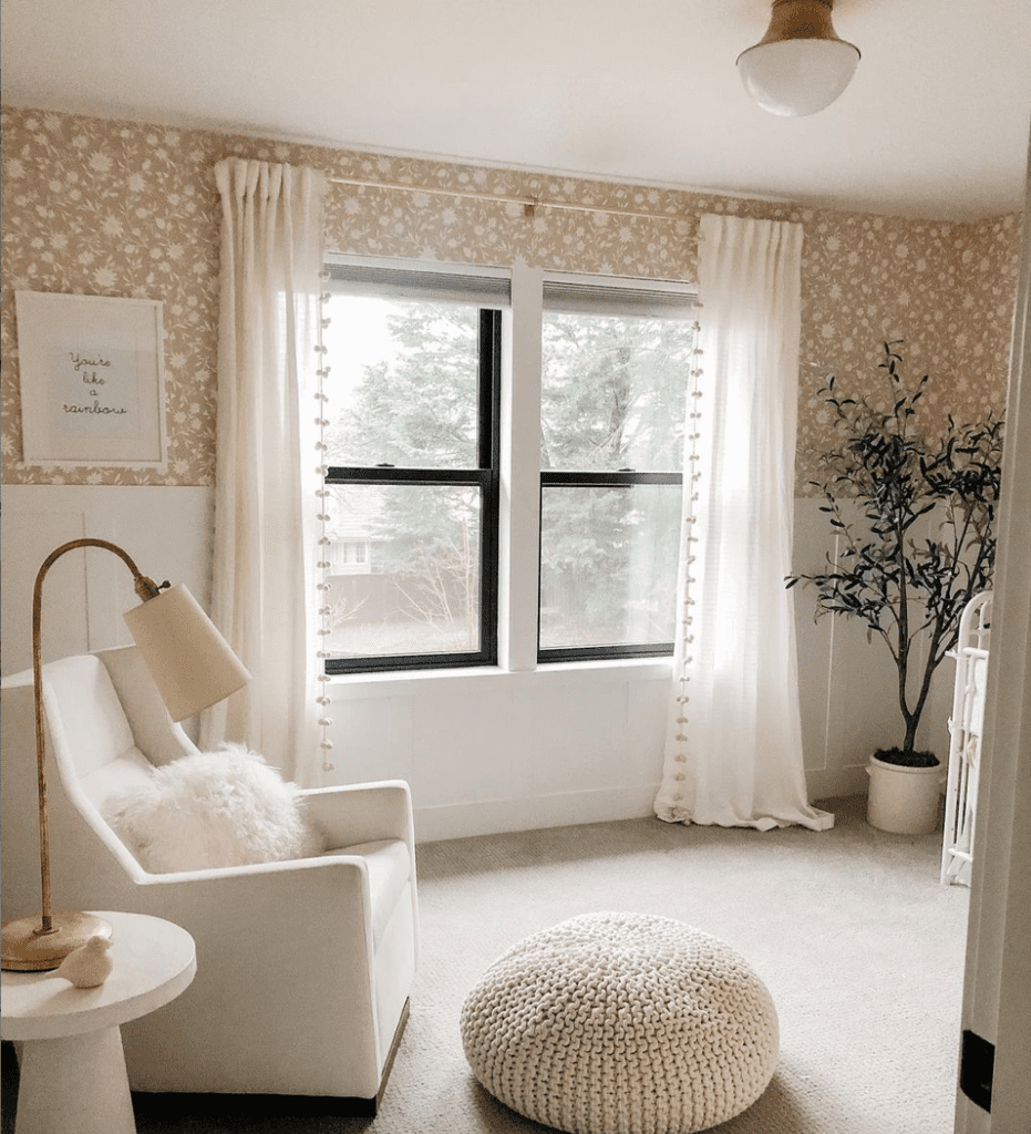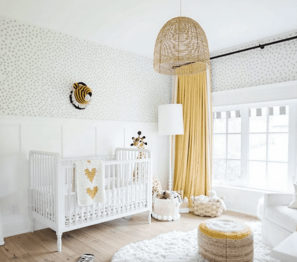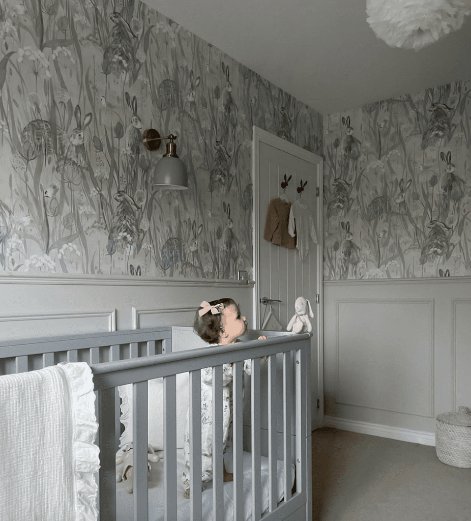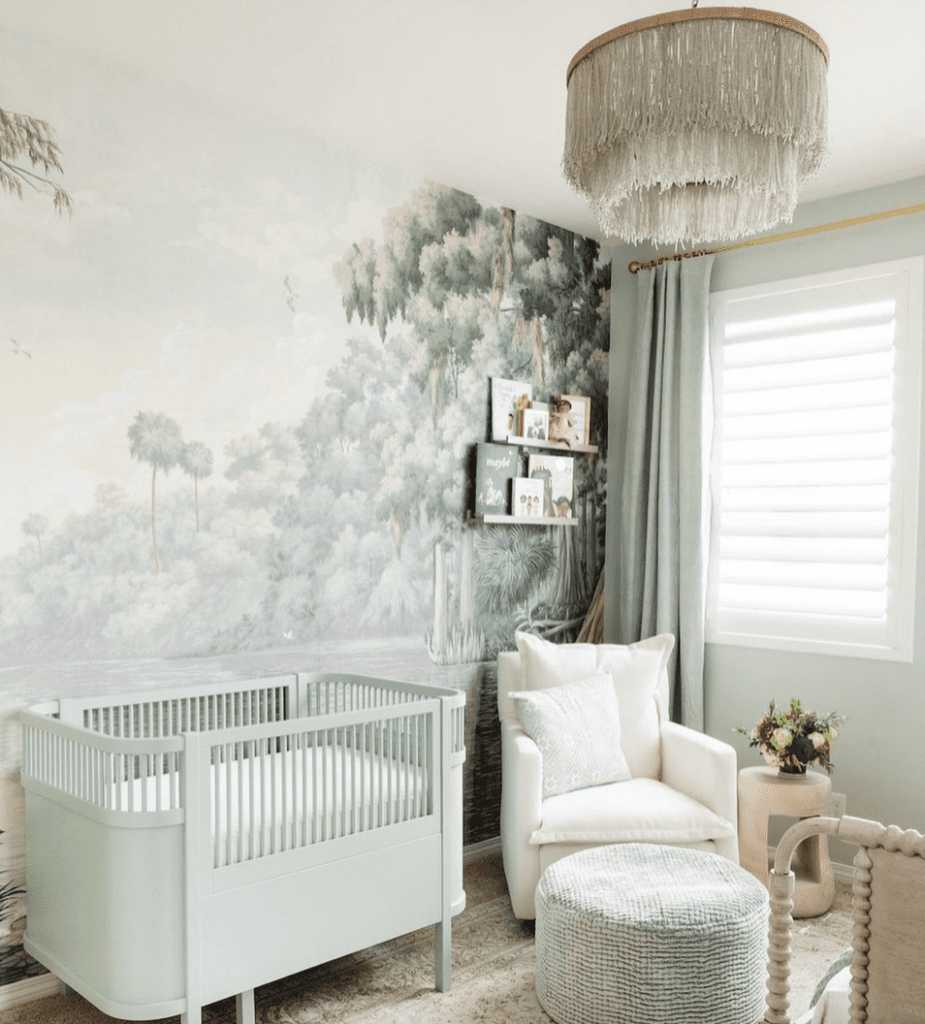 For your nursery wallpaper, why not go big? There’s never been a better market for bold patterns in modern wall paper, and there are even several peel and stick options that are high quality and super easy to install. We found this incredible pattern from @willaandthebear.