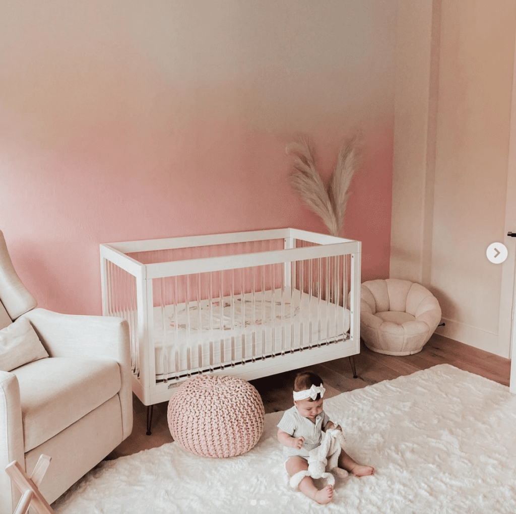 An ombre accent wall? Absolutely gorgeous! This pink nursery found on @worldkindbrand makes a stunning statement, and is accented by textured ottomans and a plush rug in bright white.