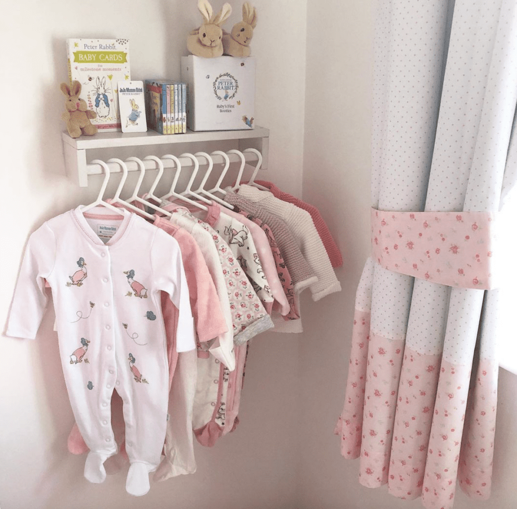 It’s probably not realistic to plan on hanging all of their baby clothes out in the open, but choosing some favorite pieces to hang on display makes a space feel cozy and welcoming by adding a personal touch, like in this little girl’s nursery from @handmade_byholly.