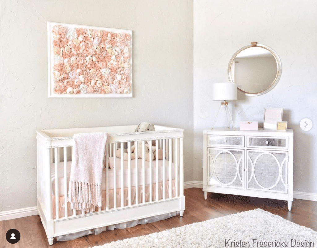 A feminine touch can be easy to achieve in your own nursery using wall art with floral themes, adding a soft pink blanket, and placing decorative items out on display.