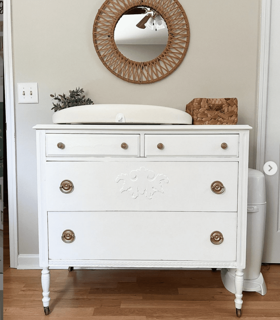 You can make a used piece of furniture charming and new again with a fresh coat of paint and updated drawer handles. @thecharlestonhome hit it out of the park with this vintage dresser repurposed as a changing table.