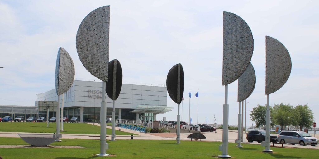 Created in 2006 by nature artist, Ned Kahn, Wind Leaves is a series of soaring aluminum columns that rotate with the wind. Located right outside Discovery World, the Leaves are covered with thousands of stainless steel disks that swirl and ripple with the wind, creating a kaleidoscope of reflections from the lake, the sky, and the city.