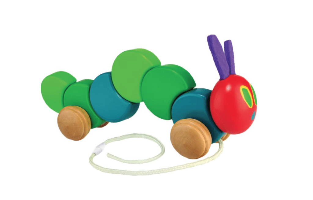 This colorful wooden pull toy is inspired by ‘The Very Hungry Caterpillar’ and has a movable, twistable body for little hands to explore. It’s made of solid wood and is BPA- and lead-free, safe for a one-year-old.