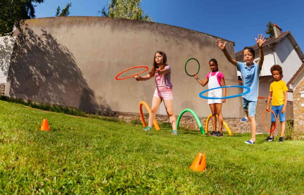 Kids can spin, toss, or jump through hula hoops in different challenges. Timed rounds make it even more fun.