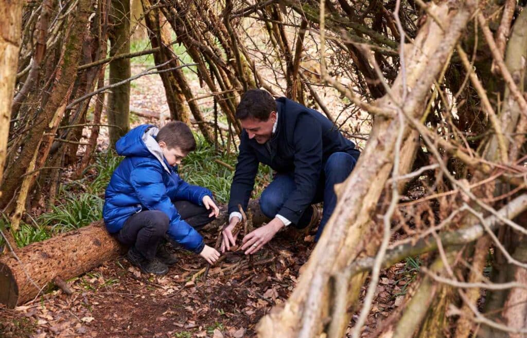Gather fallen branches and leaves and build a lean-to or teepee, then let kids “decorate” it with pinecones, ferns, or a little camp sign they make with a stick and mud.
