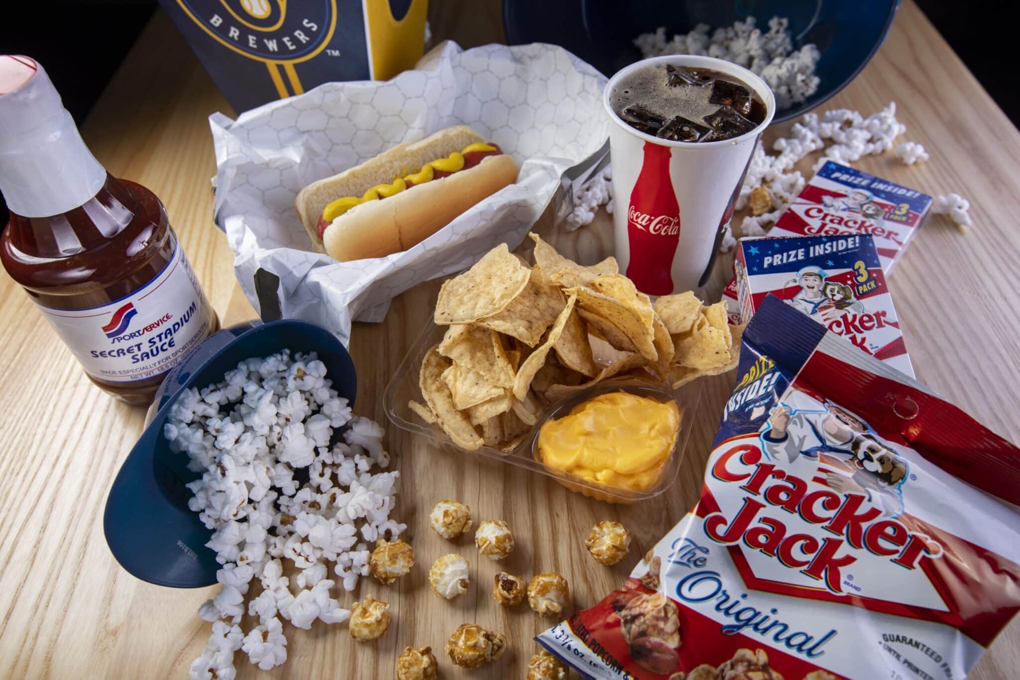 A spread of classic ballpark snacks including a hot dog with mustard, nachos with cheese, Cracker Jack, popcorn, a soft drink, and a bottle of Milwaukee’s famous Secret Stadium Sauce, all arranged on a wooden table.