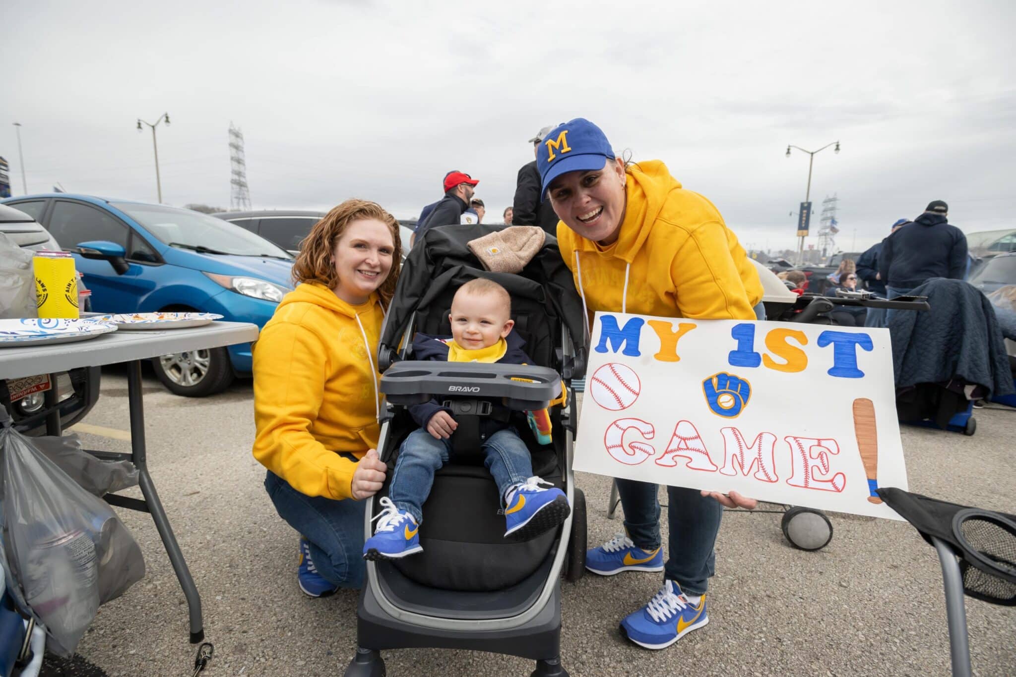 Two smiling adults wearing Brewers gear pose with a baby in a stroller in a parking lot, holding a handmade sign that reads "My 1st Game."