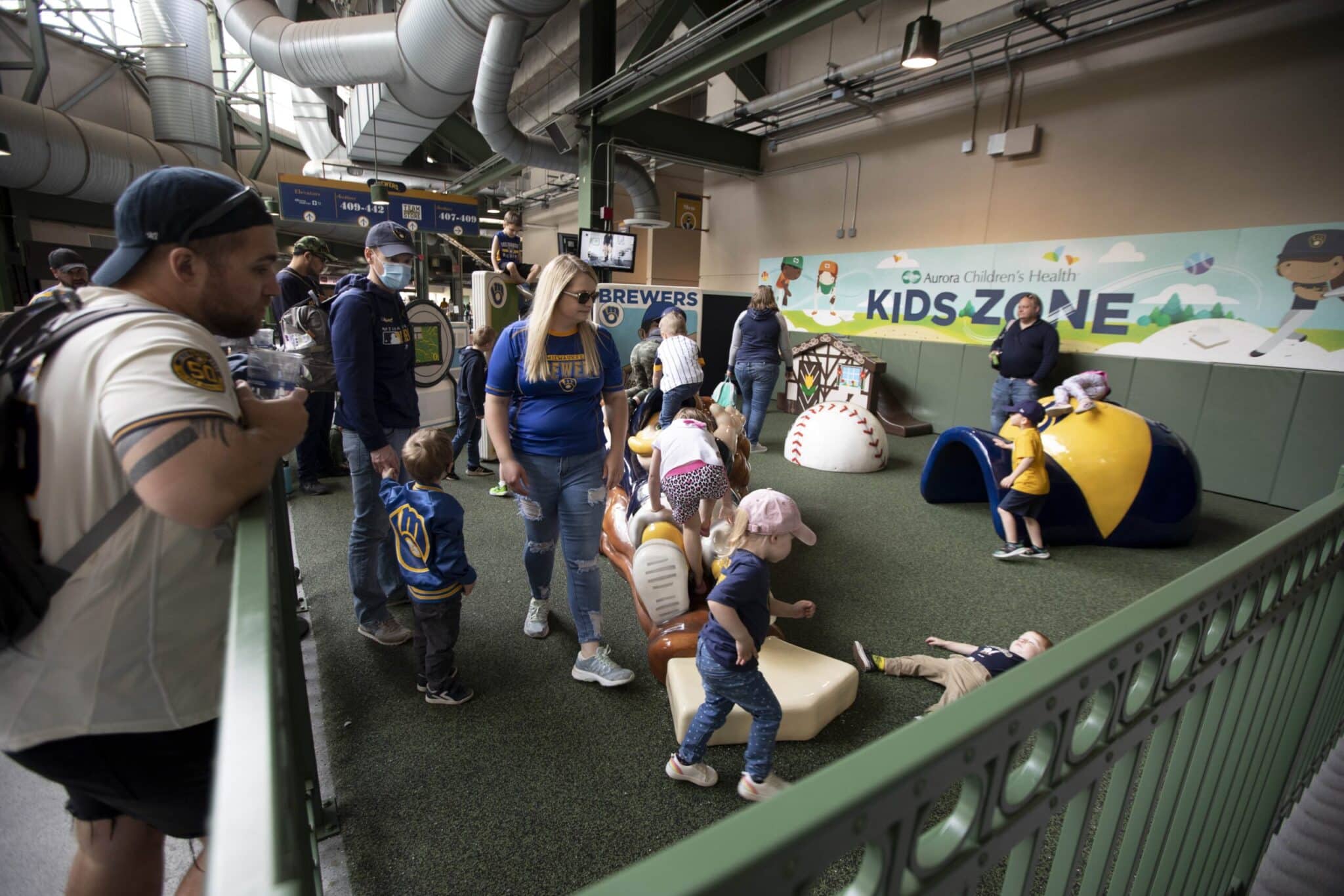 Children and families enjoy the Aurora Children’s Health Kids Zone inside American Family Field, featuring soft play structures shaped like baseball equipment.