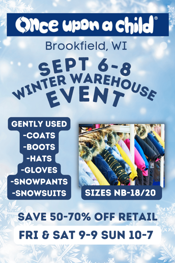 That’s why our friends at Once Upon a Child Brookfield are hosting their Winter Warehouse Event from September 6th through 8th. It’s the perfect time to prepare for those chilly days ahead, all while scoring incredible deals on essential winter gear for your kids.