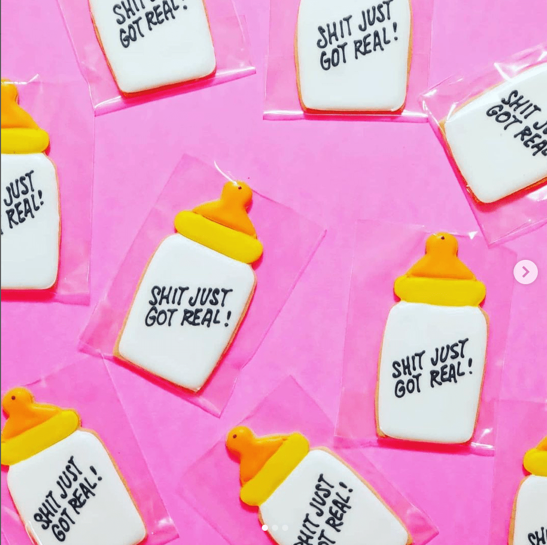 For a playful twist, try cookies with bold phrases like “Shit Just Got Real!” from @azucarrococo—perfect for a fun family reveal.