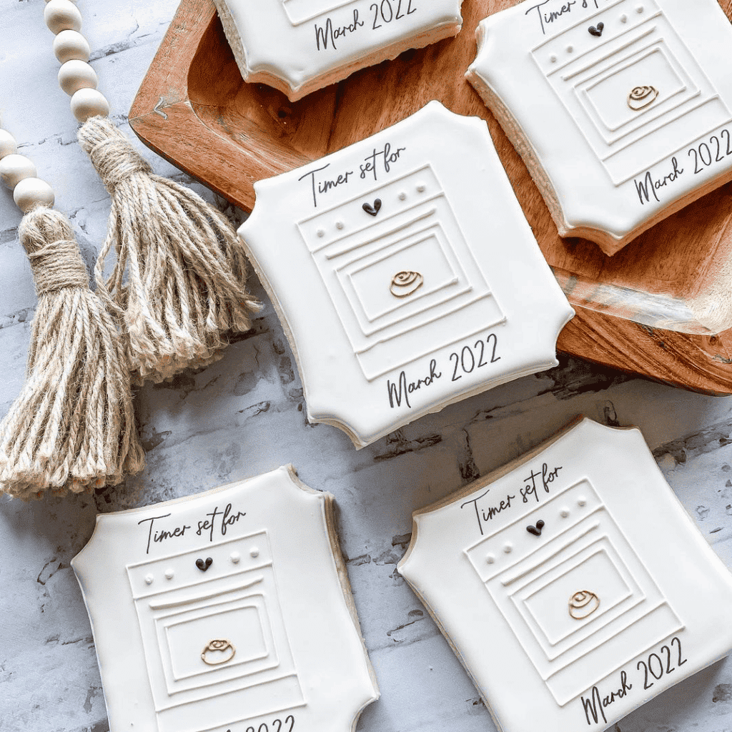 Who can resist a cookie? Make your pregnancy announcement even sweeter with custom cookies featuring designs like “Bun in the Oven” or baby-themed messages. Contact a local bakery to create these tasty treats, or get inspired by designs from @michikocookiecompany.