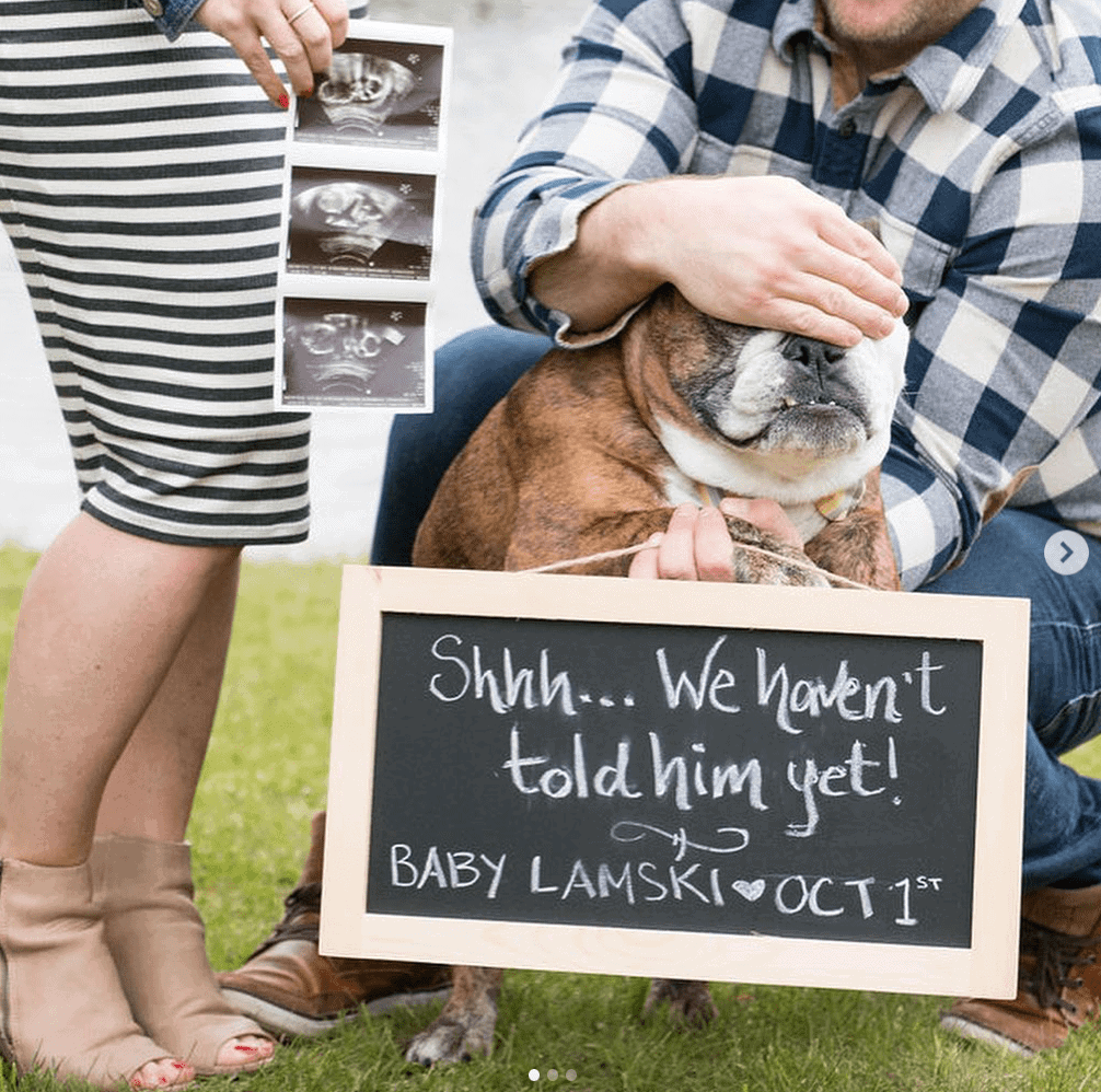 If you’re already a dog parent, then the best way to break the news to everyone is to get your furry friend in on the action. This sign from Etsy says “My parents are getting me a human”.