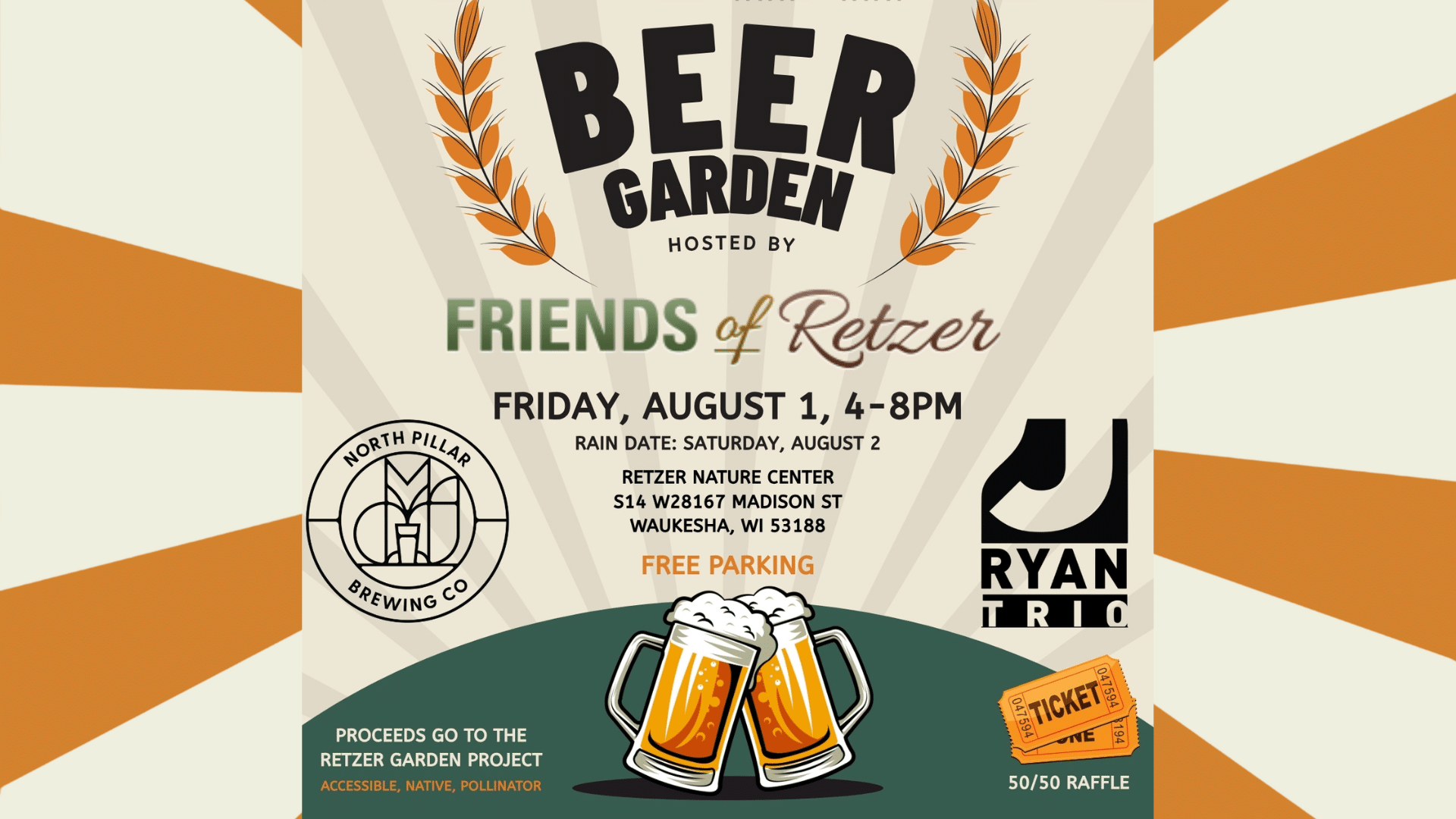 FRIENDS OF RETZER NATURE CENTER BEER GARDEN Enjoy a fun evening out! Grab some food, drinks, and try the 50/50 raffle, with all proceeds benefiting the Friends of Retzer Nature Center in support of Retzer Nature Center programs and initiatives. The event will feature beer from North Pillar Brewing Co, live music from the J Ryan Trio,...