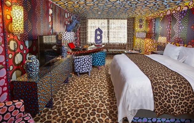 The rooms range from space themed to jungle themed, and there are even suites with a boat-shaped bed, an igloo, and a tipi, a space capsule, and a hot air balloon.
