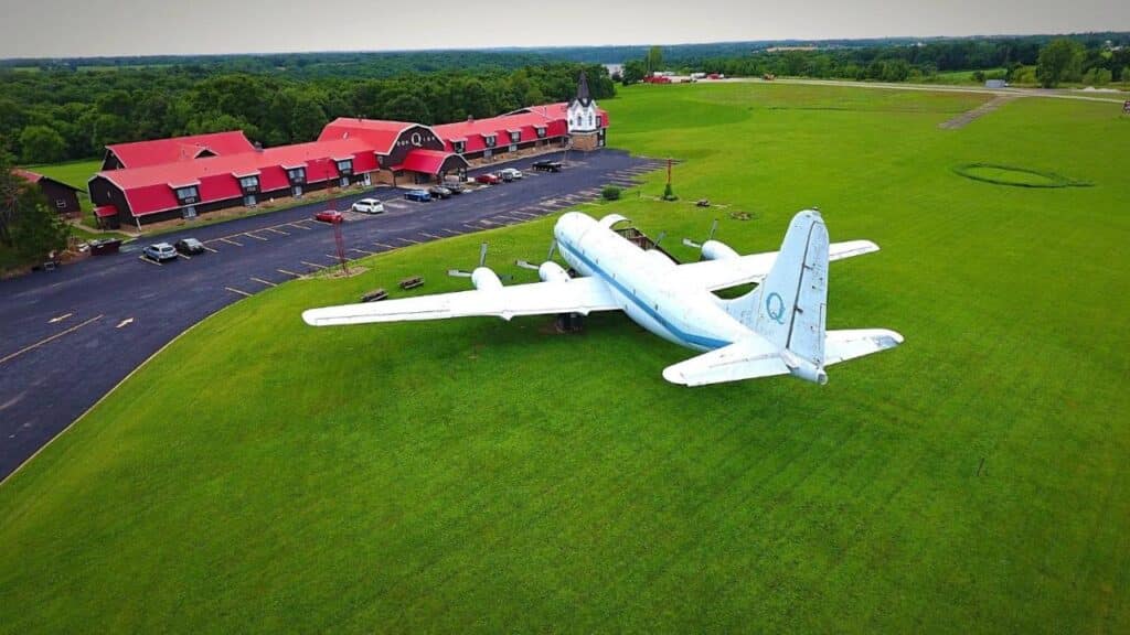 The Don Q Inn in Dodgeville, Wisconsin is known for its quirky themed rooms, and there’s a real airplane parked outside!