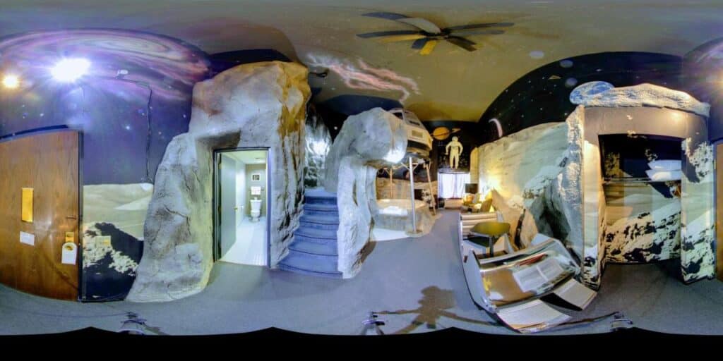 With over 8100 – 8750 sq. ft. of space, it offers a unique experience with an observatory, telescopes, a vintage arcade gallery, a rock star room, and a 35-seat movie theater.