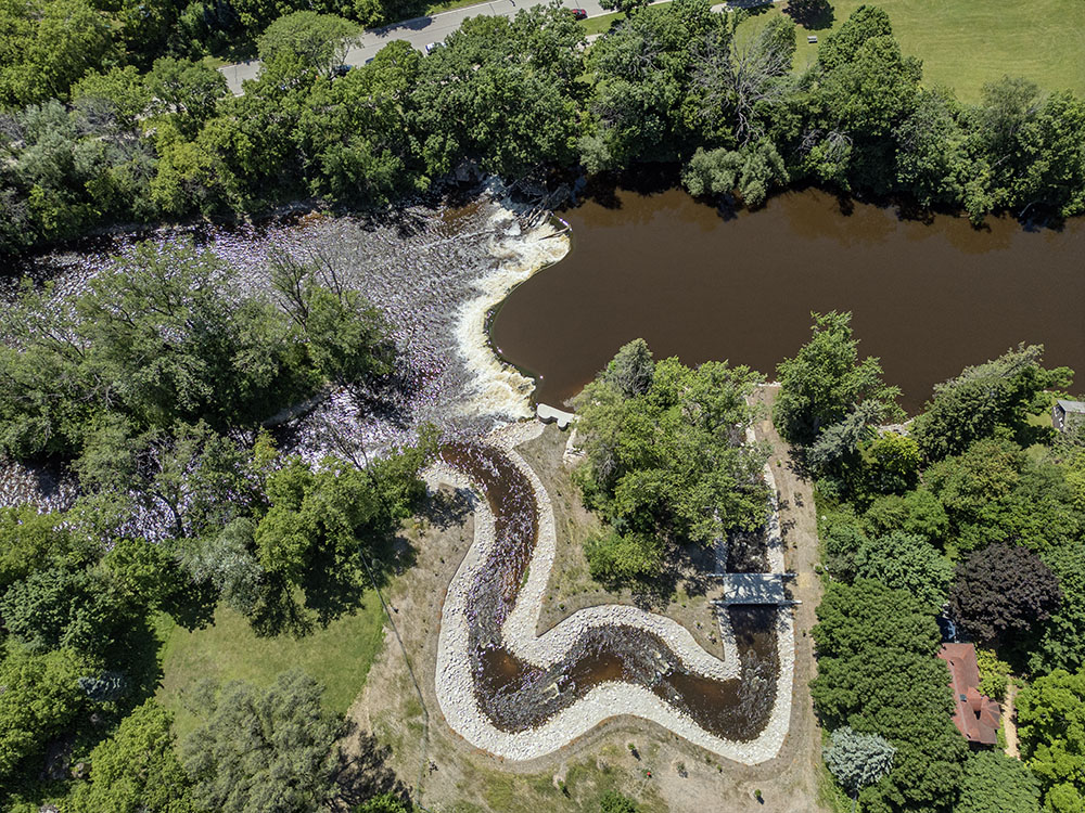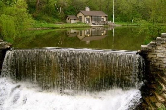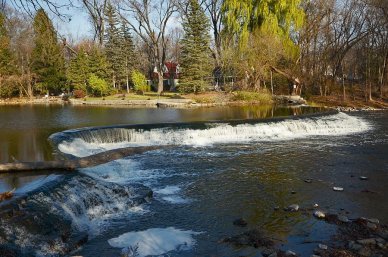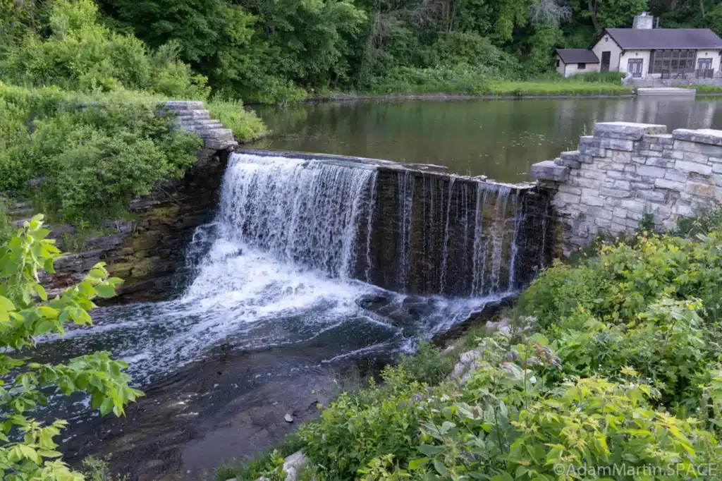 Kletzsch Park in Glendale is home to a beautiful waterfall (officially a dam) located on Milwaukee River Parkway and along the Oak Leaf Trail. They recently built a picturesque fish passageway for migrating fish to more easily get around the dam.