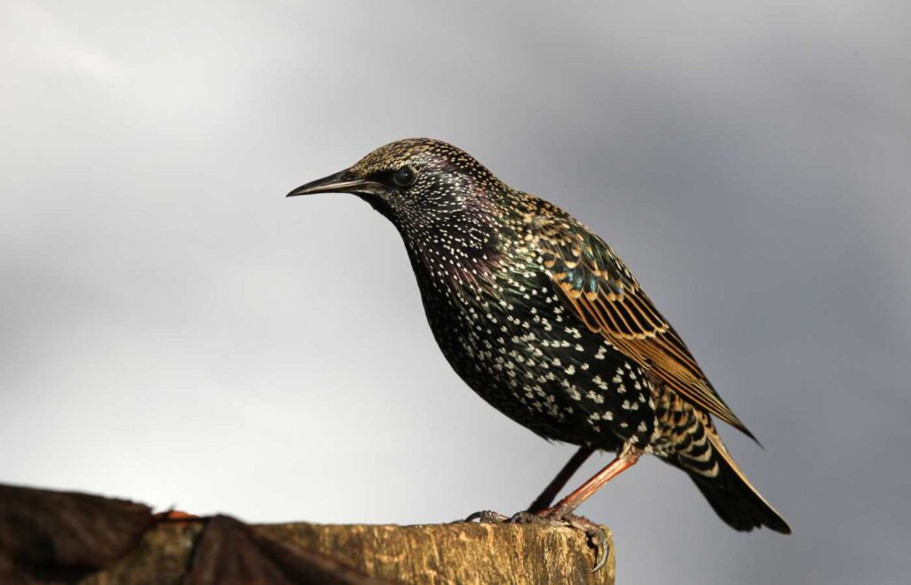Description: Starlings are iridescent black with a short tail; House Sparrows are brown and gray with a shorter, chunkier appearance.