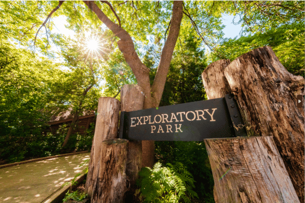 Pro Tip: When you need a calming break from the fun, your kids might also love Exploratory Park, where they can explore Paradise Pond, an oversized chess board, hopscotch, bag toss, quirky toad stools, a dragonfly bench, a sand box, and more.